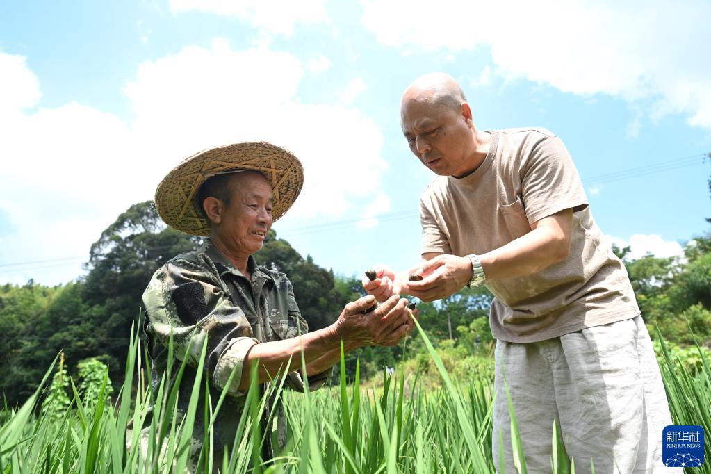 8月9日,農業(yè)推廣研究員練進(jìn)旺(右)在迪口鎮店村村一處稻螺種養田指導農民鄭智富采收田螺。