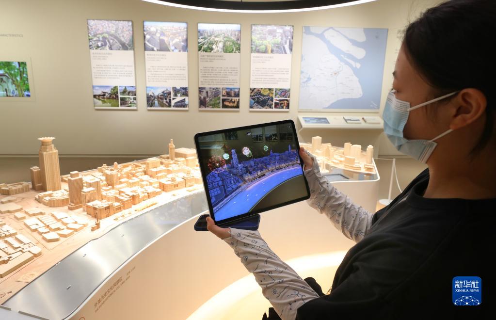 8月11日,一位參觀(guān)者在上海城市規劃展示館體驗增強現實(shí)技術(shù)(AR)觀(guān)看城市建筑模型沙盤(pán)。