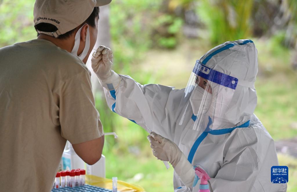8月11日,湖北省援海南三亞醫療隊的醫護人員余璐(右)在三亞市吉陽(yáng)區東岸村為居民進(jìn)行核酸采樣。