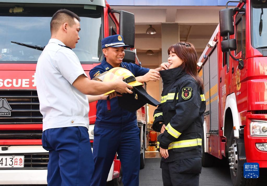 萍鄉市消防救援支隊的消防員幫陶佳煜穿上消防服,讓她親身體驗消防員的工作(7月11日攝)。