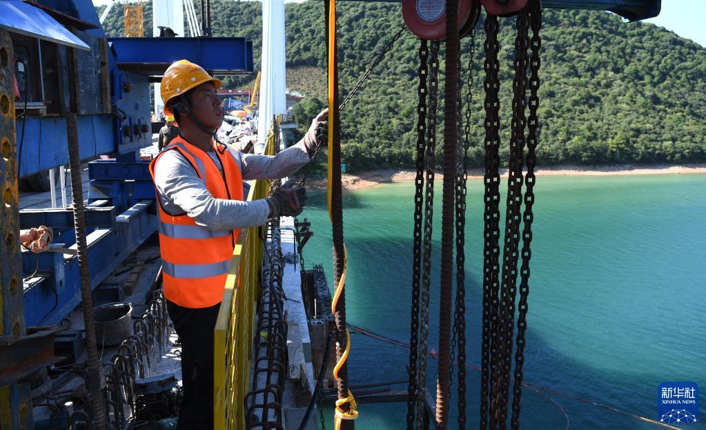 8月12日,工人在中國鐵建大橋局池黃鐵路太平湖特大橋建設工地施工。