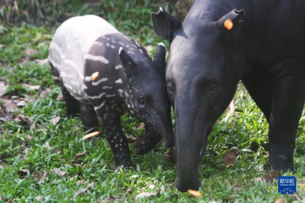 8月8日,馬來(lái)貘幼崽(左)與母親在新加坡夜間野生動(dòng)物園活動(dòng)。