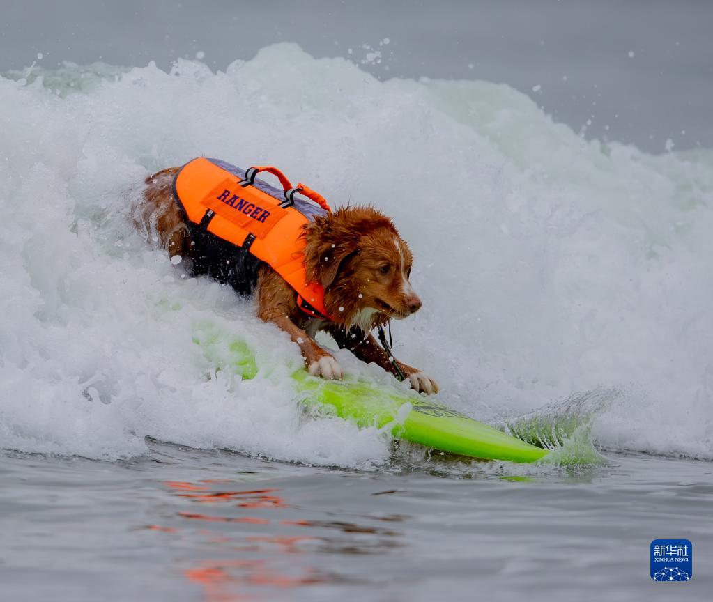 8月6日,在美國加州舊金山灣區帕西菲卡,一只狗狗參加沖浪比賽。