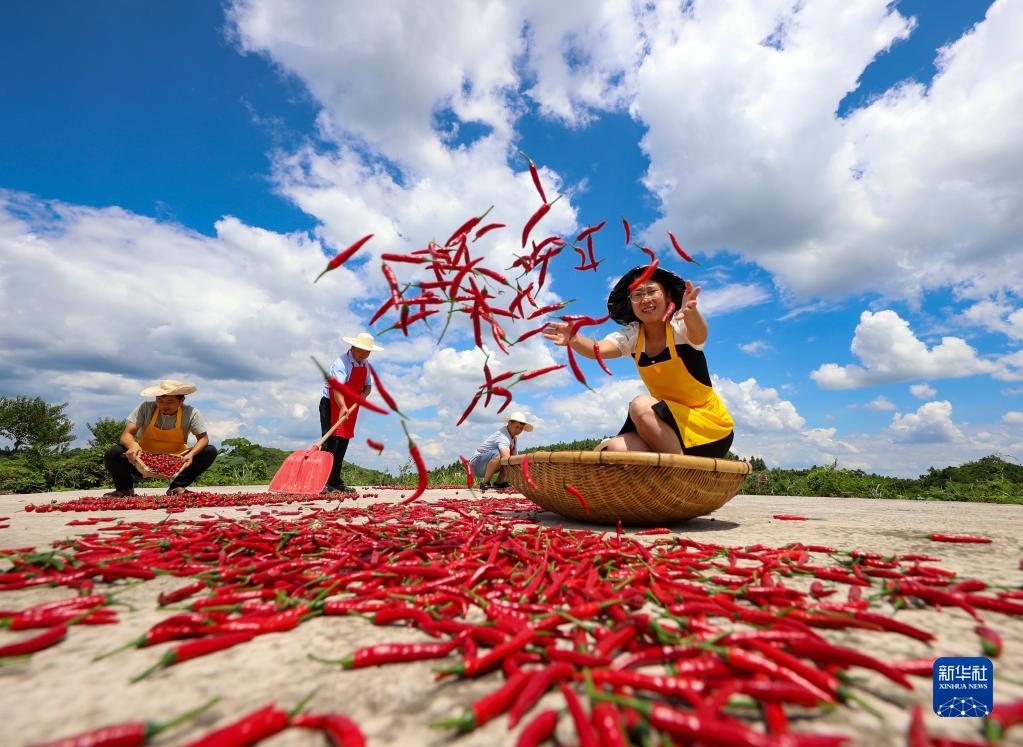 8月13日,村民在貴州省黔東南苗族侗族自治州岑鞏縣平莊鎮包東村晾曬辣椒。