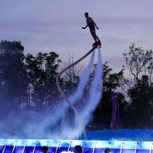 8月13日,工作人員在建德市楊村橋鎮十里埠黃金水岸國際濱水公園旁的水面上進(jìn)行水上表演(無(wú)人機照片)。