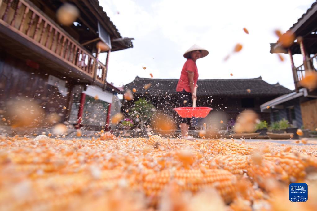 8月14日,村民在貴州省黔東南苗族侗族自治州岑鞏縣注溪鎮衙院村晾曬玉米。