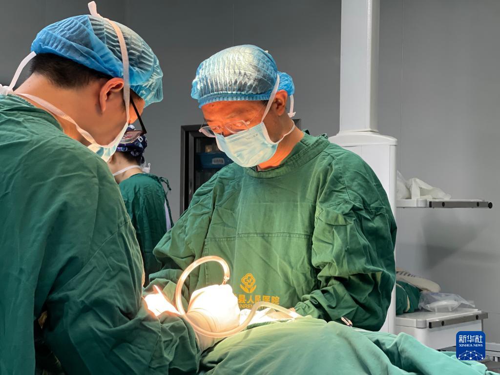 8月10日,在重慶市巫溪縣人民醫院,田壩鎮雙箭村駐村第一書(shū)記廖正步(右)與當地醫生一起進(jìn)行手術(shù)。