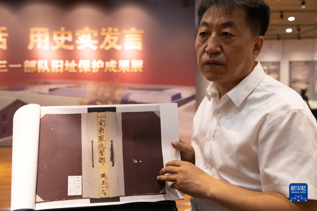 侵華日軍第七三一部隊罪證陳列館館長(cháng)金成民向記者介紹《關(guān)東軍化學(xué)部留守名簿》(8月13日攝)。