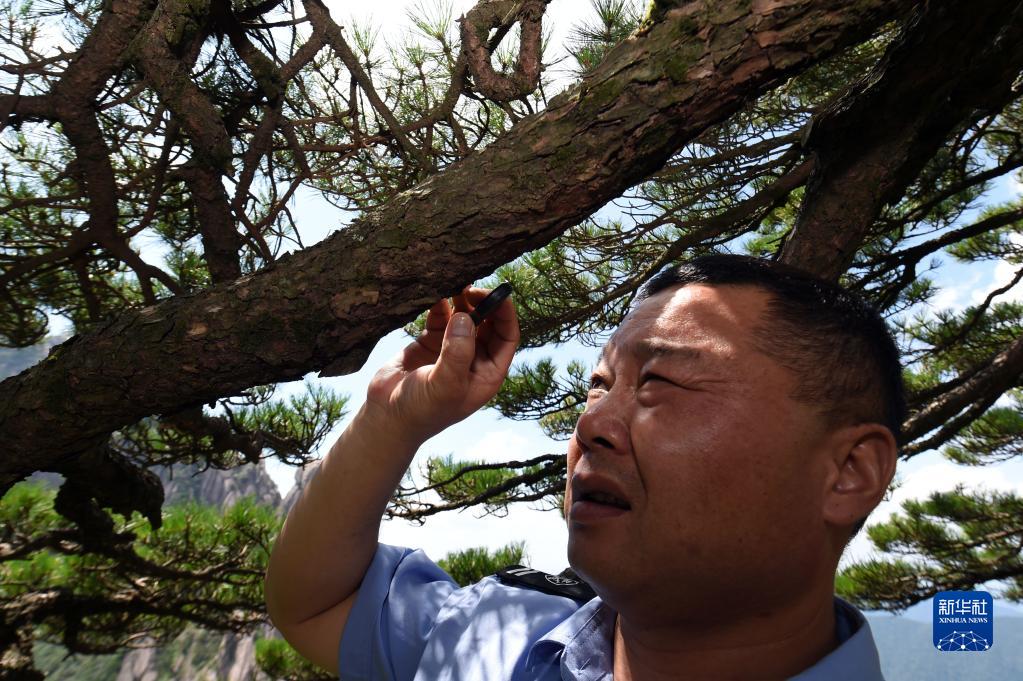 8月14日,胡曉春用放大鏡檢查迎客松的樹(shù)皮和紋理,以便及時(shí)發(fā)現病蟲(chóng)害。
