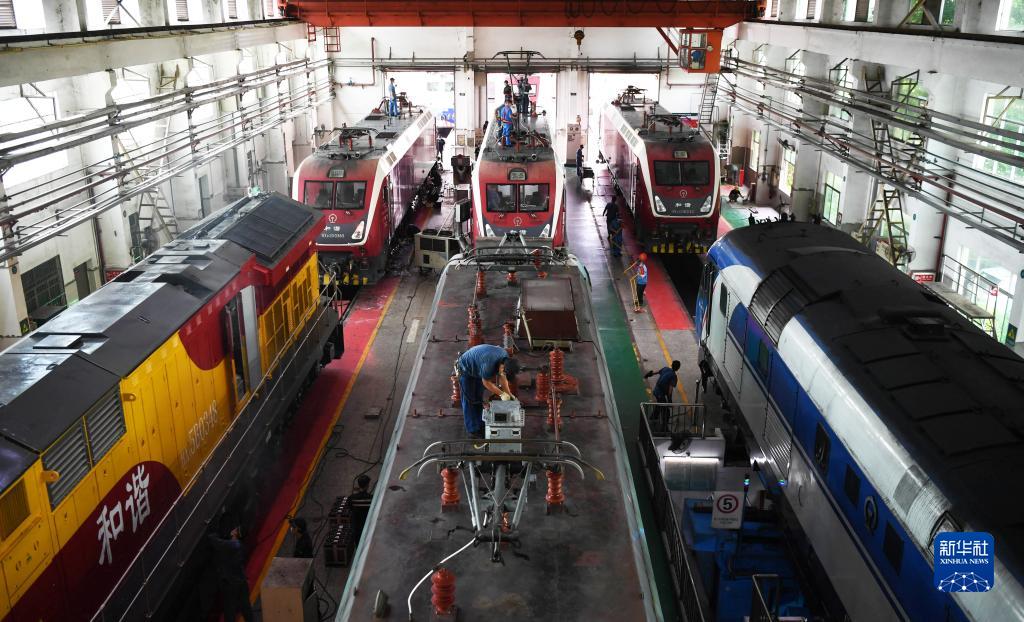 8月16日,廣州機務(wù)段職工在檢修機車(chē)車(chē)頂高壓設備。
