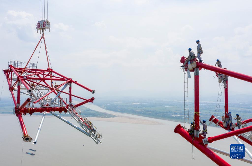 白鶴灘至浙江特高壓直流輸電工程安徽段長(cháng)江跨越塔全部組立完成