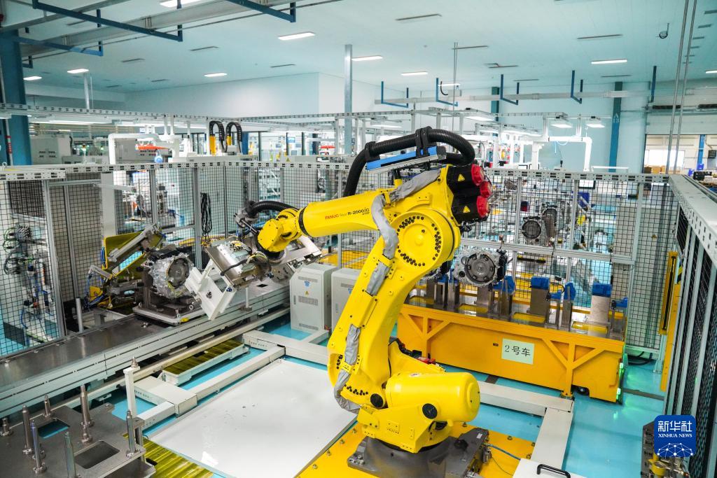 在哈爾濱東安汽車(chē)動(dòng)力股份有限公司生產(chǎn)車(chē)間,一臺機械臂在生產(chǎn)作業(yè)(8月16日攝)。