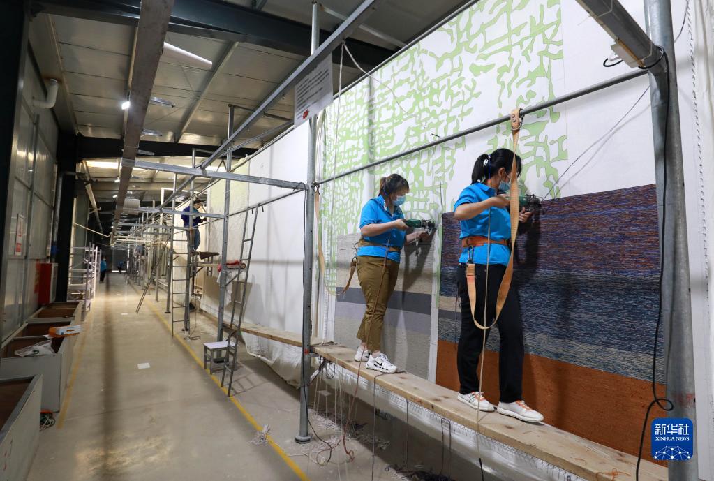 8月17日,在河北省石家莊市行唐縣一家外貿地毯生產(chǎn)企業(yè),工人在手工織制地毯。