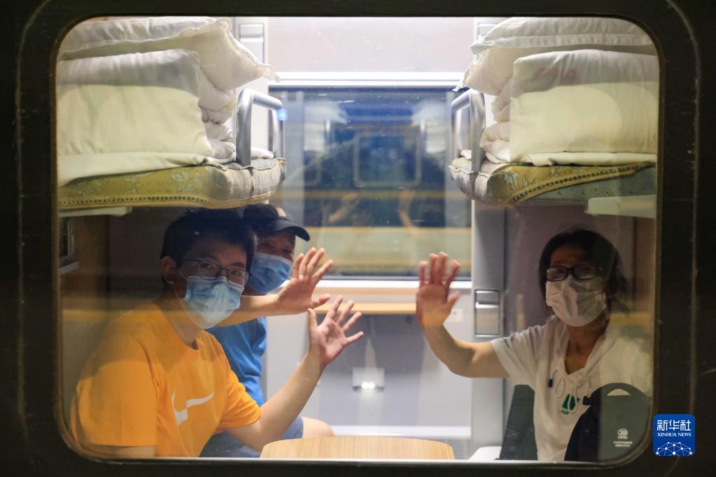 在南昌火車(chē)站,劉熙鴻和家人在前往北京的火車(chē)上向窗外揮手告別(8月15日攝)。