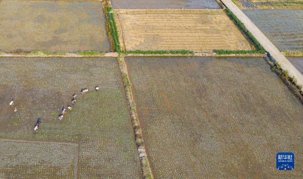 8月18日,在峨眉山市桂花橋鎮廟稿村,村民在水稻田里種植中藥澤瀉(無(wú)人機照片)。