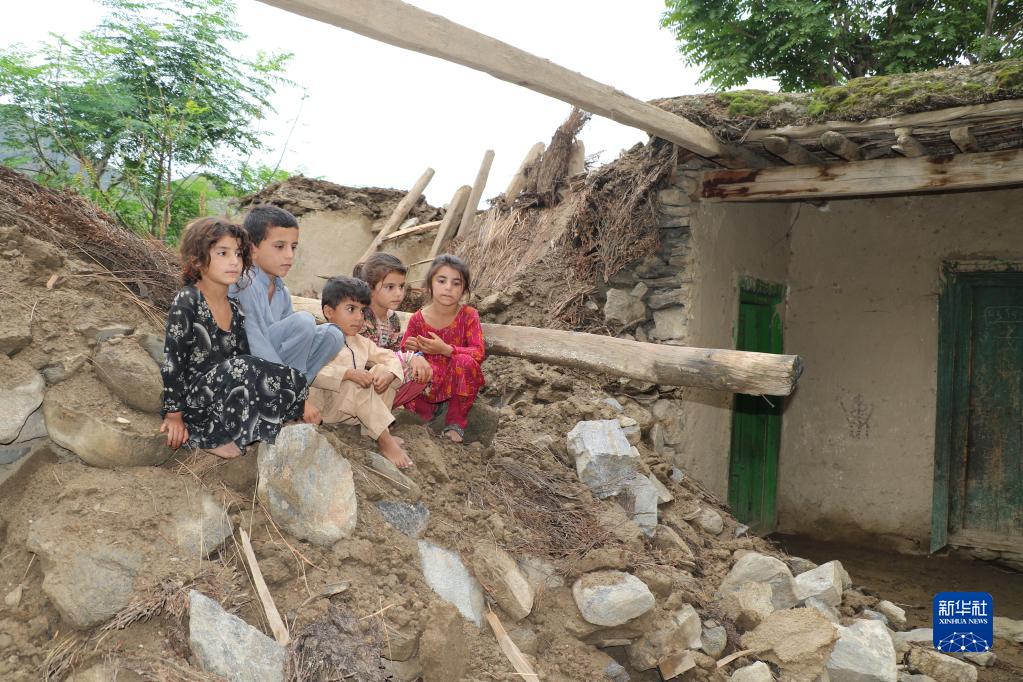 8月18日,孩子們坐在阿富汗努里斯坦省被洪水損毀的房屋廢墟上。