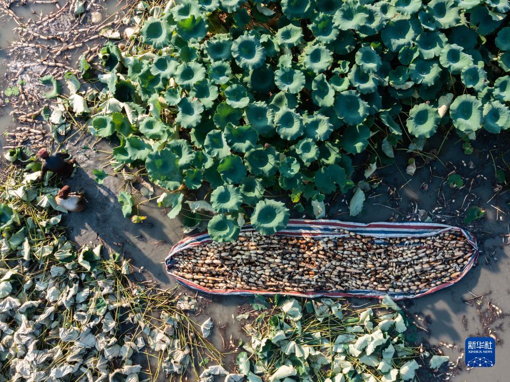 8月19日,種植戶(hù)在藕塘里收獲新鮮的蓮藕(無(wú)人機照片)。