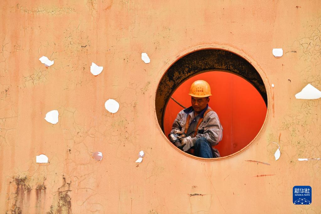 8月19日,工人在合龍后的貴州龍里河大橋上對附屬工程進(jìn)行施工。