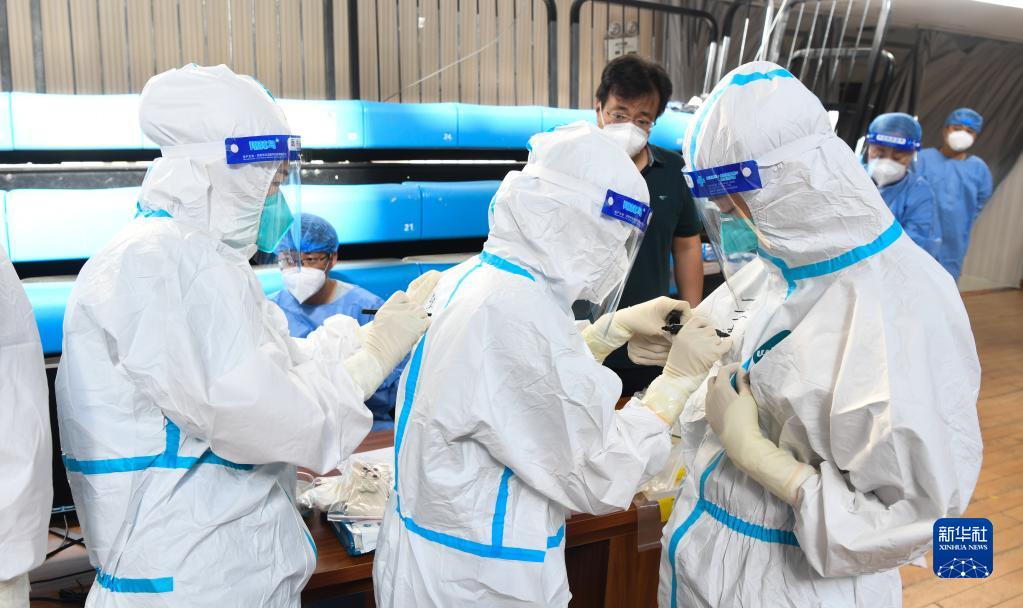 8月16日,在海南陵水黎族自治縣體育館氣膜實(shí)驗室,山東省醫療隊醫務(wù)人員在防護服上寫(xiě)下名字。