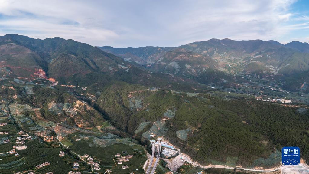 8月19日拍攝的華麗高速營(yíng)盤(pán)山隧道洞口一景(無(wú)人機全景照片)。