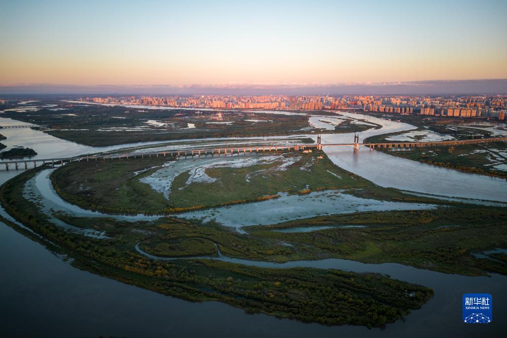 這是8月19日拍攝的位于哈爾濱市的陽(yáng)明灘大橋附近的濕地景色(無(wú)人機照片)。