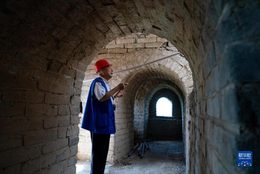 工程師程永茂在“西大墻”段158號敵臺巡視,經(jīng)老磚修復,敵臺內的券洞恢復舊貌(8月16日攝)。