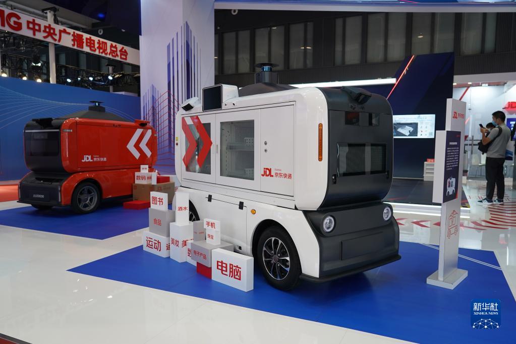 這是在2022世界機器人博覽會(huì )“機器人+物流”展區現場(chǎng)拍攝的智能零售車(chē)(前)(8月18日攝)。