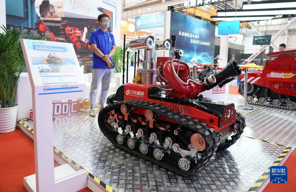 這是在2022世界機器人博覽會(huì )“機器人+制造”展區現場(chǎng)拍攝的防爆消防偵察機器人(8月19日攝)。