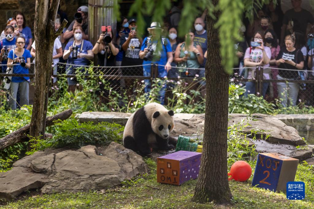 8月21日,在美國華盛頓史密森學(xué)會(huì )國家動(dòng)物園,人們在大熊貓幼崽“小奇跡” 兩歲生日當天前來(lái)參觀(guān)。
