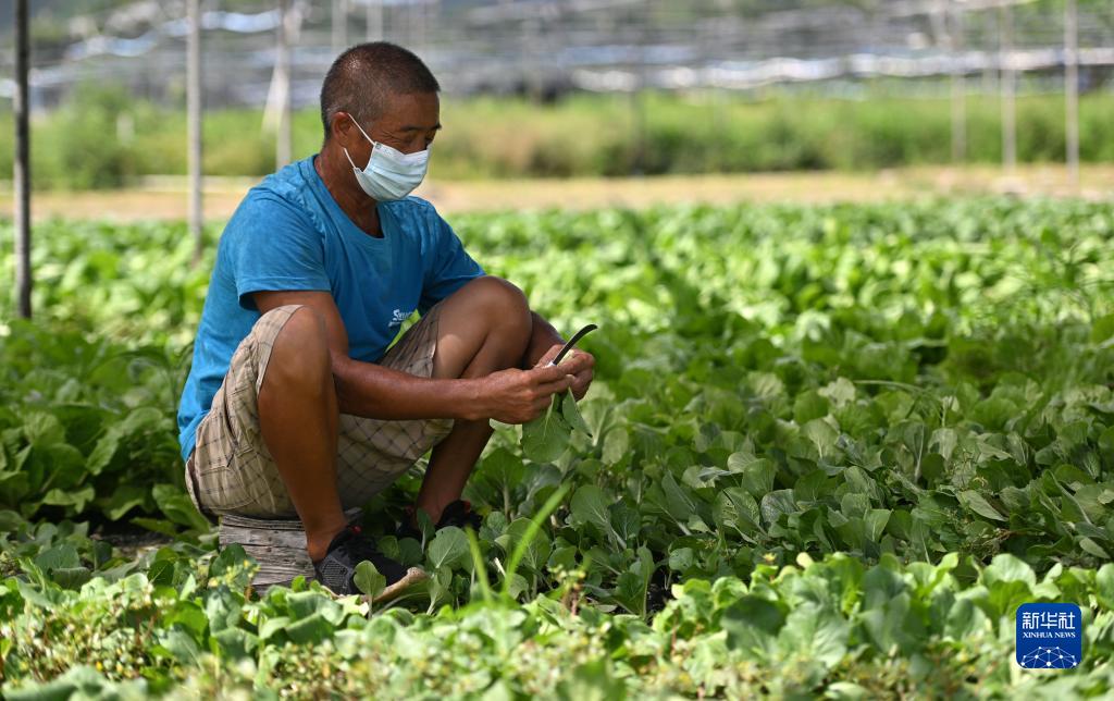 8月22日,三亞市三川葉菜產(chǎn)銷(xiāo)農民專(zhuān)業(yè)合作社的農民在菜地中采摘蔬菜。