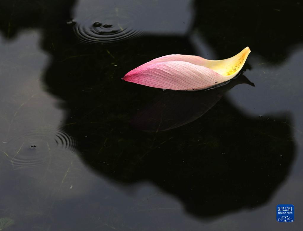 8月16日,在江蘇蘇州拙政園荷塘間,一片荷花花瓣漂在水面。