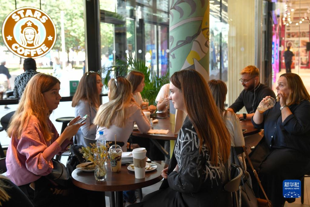 8月22日,人們在俄羅斯莫斯科一家“星咖啡”門(mén)店用餐。