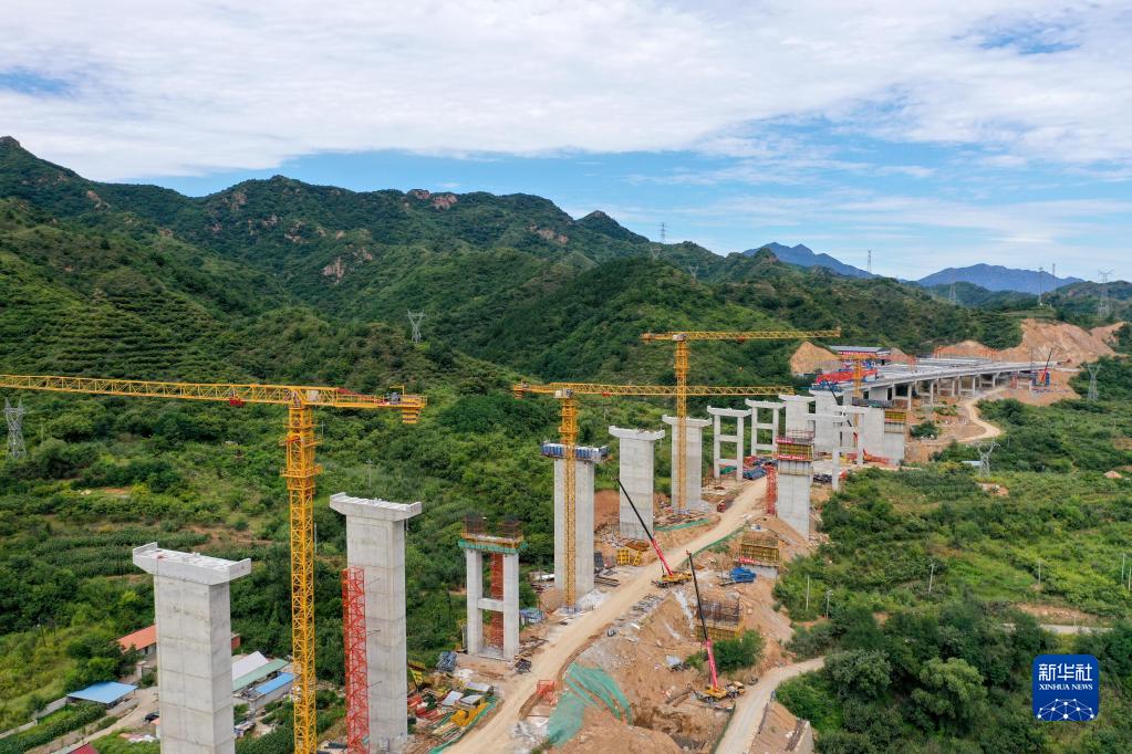 這是8月23日拍攝的首都地區環(huán)線(xiàn)高速公路承德至平谷段四頃地特大橋施工現場(chǎng)(無(wú)人機照片)。 新華社發(fā)(王立群 攝)