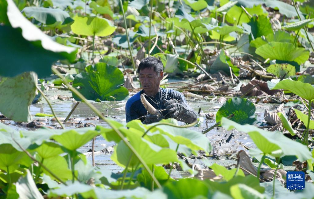 8月24日,在山東省微山縣高樓鄉,村民在收獲蓮藕。
