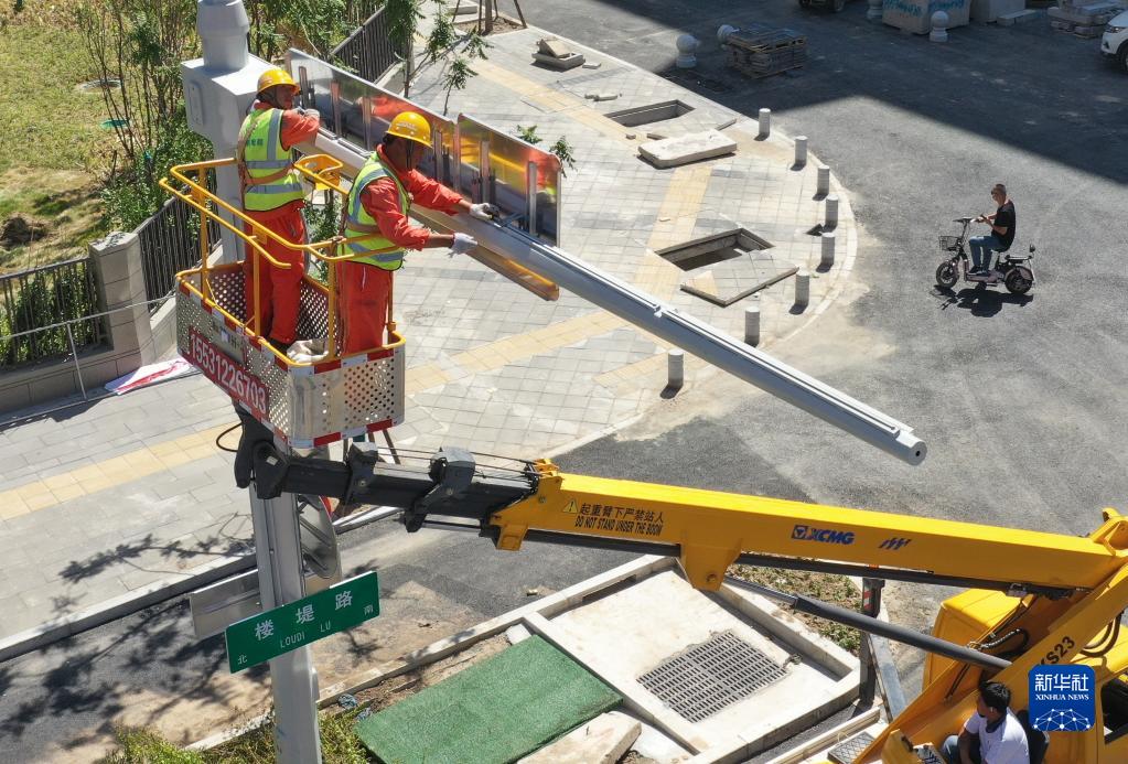 8月25日,工人在雄安新區容西片區進(jìn)行市政安裝施工(無(wú)人機照片)。