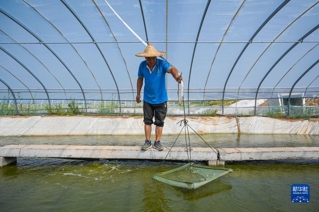 8月25日,鹽堿水對蝦養殖園區工作人員查看對蝦生長(cháng)情況。