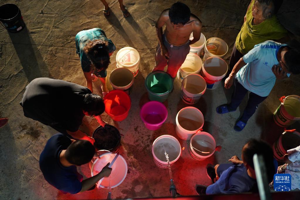 瑞昌市范鎮上源村村民用桶裝消防員送來(lái)的水(8月23日攝)。
