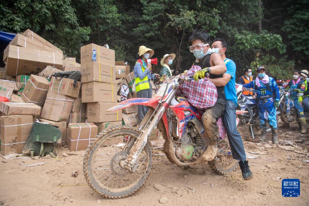 8月26日,在重慶北碚區歇馬街道,“摩托大軍”志愿者運送物資和人員上山。
