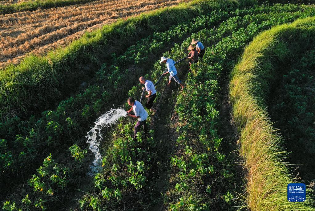 8月22日,四川省廣安市廣安區恒升鎮梓潼村黨員干部和村民在大豆基地澆水抗旱。