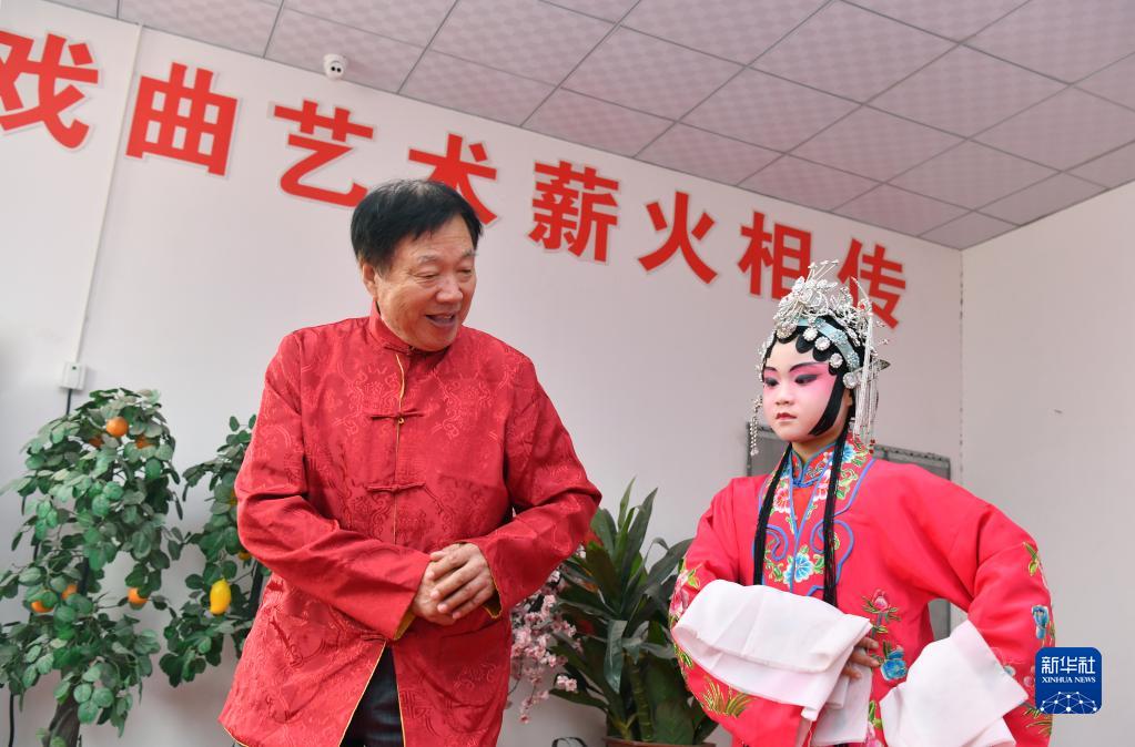 8月28日,在河北省青縣“哈哈腔”傳承示范基地,非遺傳承人劉宗發(fā)給小學(xué)員說(shuō)戲。