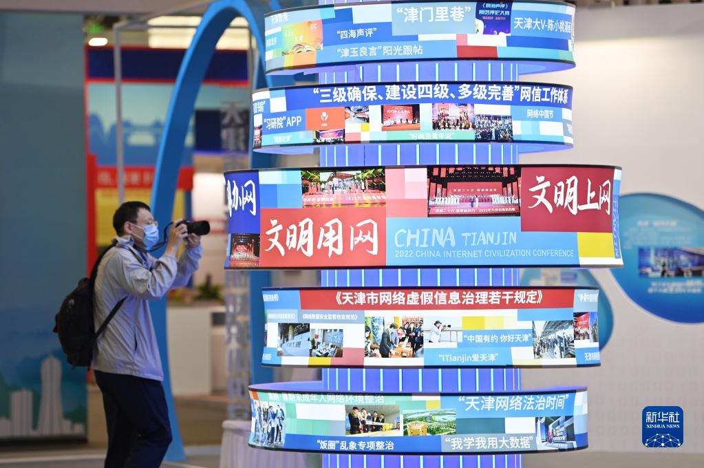8月28日,在國家會(huì )展中心(天津),參會(huì )者在2022年中國網(wǎng)絡(luò )文明大會(huì )現場(chǎng)拍攝展覽。
