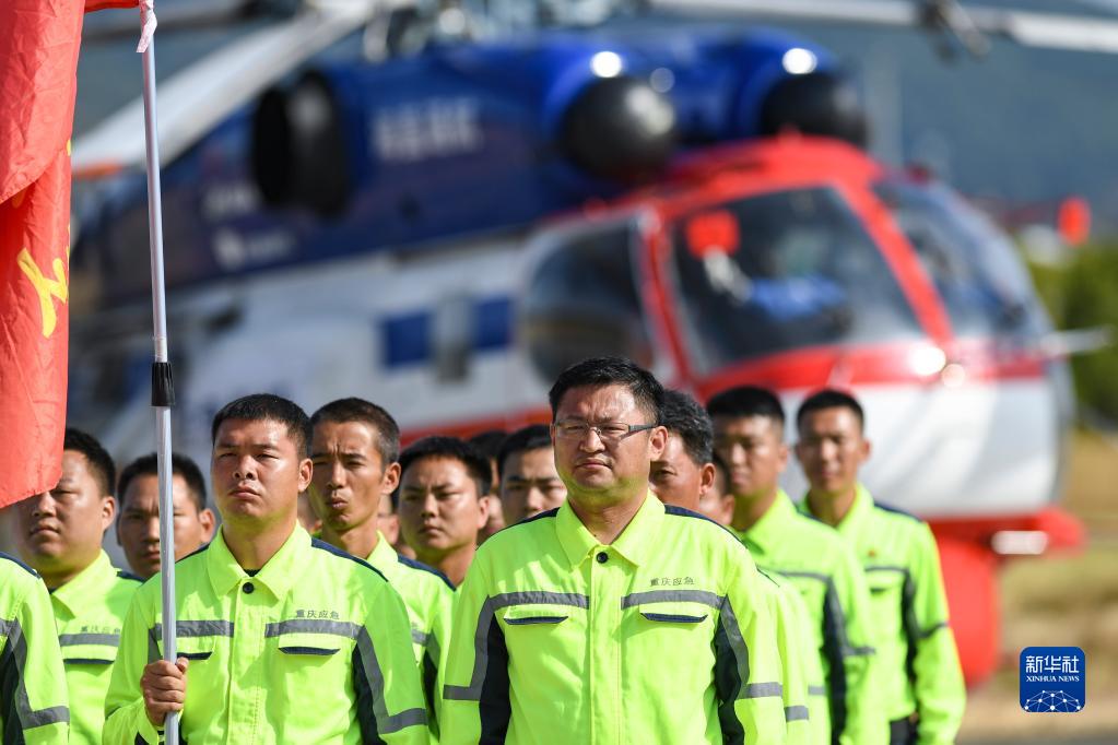 8月28日,在重慶龍興通用機場(chǎng),參與重慶火場(chǎng)撲救任務(wù)的航空應急救援人員出席慰問(wèn)儀式。