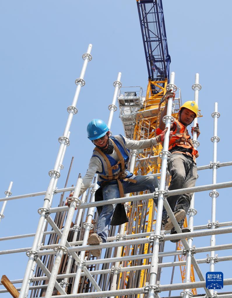 8月29日,工人在臨港西島金融中心項目工地上,安裝用于塔樓剪力墻鋼筋綁扎的腳手架。