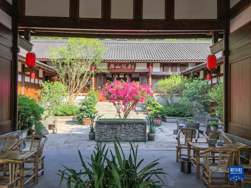 這是7月28日在重慶市巴南區天星寺鎮芙蓉村拍攝的依托清代“廖家大院”舊址上復原建造的民宿“別花山房”。