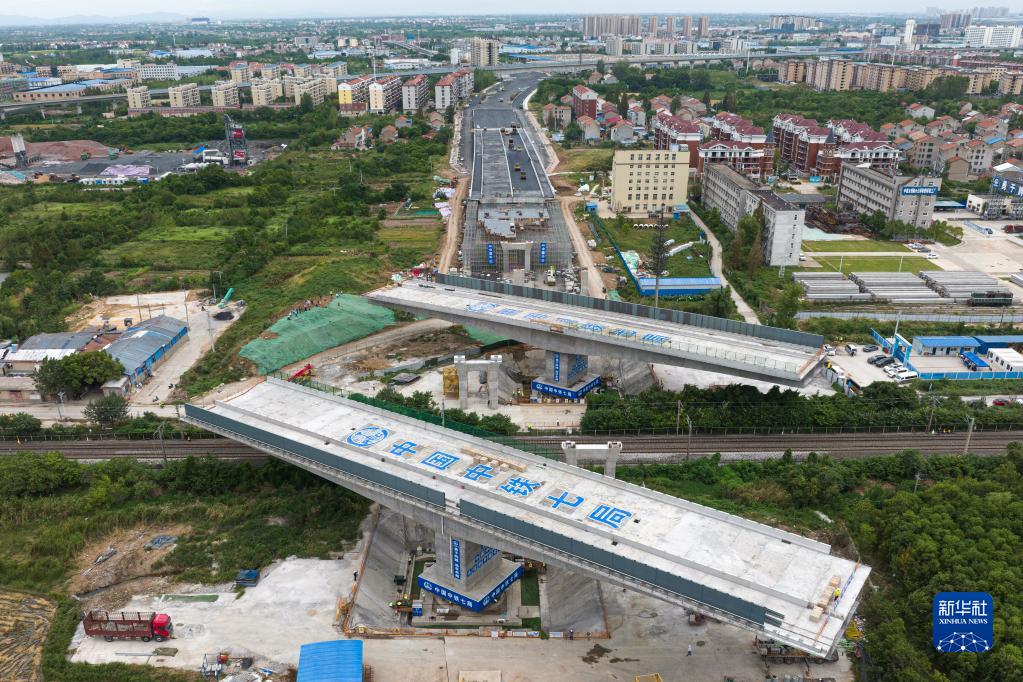 這是8月30日拍攝的湖北孝感兩座萬(wàn)噸橋梁轉體“跨越”京廣鐵路施工場(chǎng)景(無(wú)人機照片)。