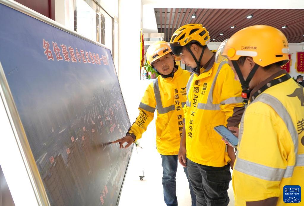 8月31日,單縣園藝街道名仕豪庭小區“暖新驛站”里張貼了小區航拍圖,幾名外賣(mài)配送員在觀(guān)看圖片熟悉小區道路。
