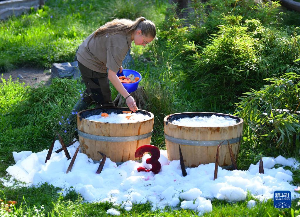 8月31日,在德國柏林動(dòng)物園,工作人員為大熊貓雙胞胎“夢(mèng)想”和“夢(mèng)圓”準備“生日桶”。