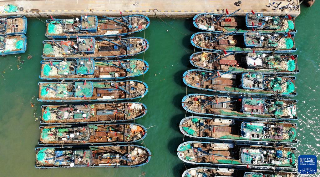 9月1日,在青島西海岸新區積米崖碼頭,漁船準備出發(fā)(無(wú)人機照片)。