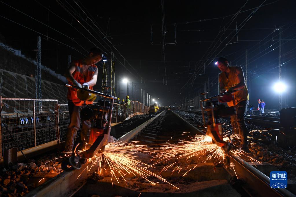 9月1日凌晨,施工人員在重慶鐵路樞紐東環(huán)線(xiàn)磨心坡站作業(yè)。新華社記者 王全超 攝