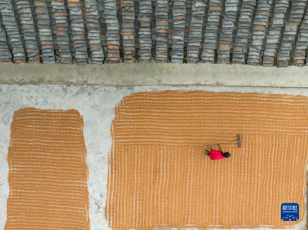 9月1日,貴州省黔西市中建鄉中廣村村民在晾曬糧食(無(wú)人機照片)。